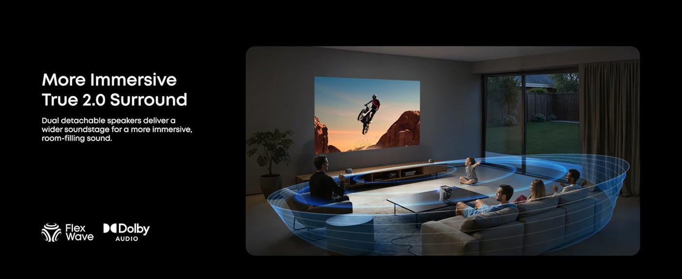 Portable projector + detachable speakers for a real big-screen experience.